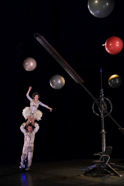 Aux Étoiles ! est un spectacle qui vient chatouiller nos vieux rêves d’astronautes, d’apesanteur et d’aventures spatiales dans l’espace infini… Là-haut dans l’univers, au cœur d’un immense planétarium, deux complices accrochent des étoiles et des planètes pour remplir l’espace du ciel. Autour d’une tournoyante machine cosmique, sorte d’astrolabe de fortune, ils accomplissent tant bien que mal leur besogne, préparant le grand décollage. Tels d’improbables clowns cosmiques, ils vous embarquent dans leurs péripéties, de défis en acrobaties, filant avec humour au travers du merveilleux et du fantastique !